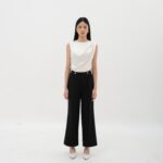 High-waisted pants with a relaxed wide-leg cut for effortless movement. The gold-accented waistband and subtle front pleats make the pants look polished