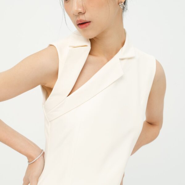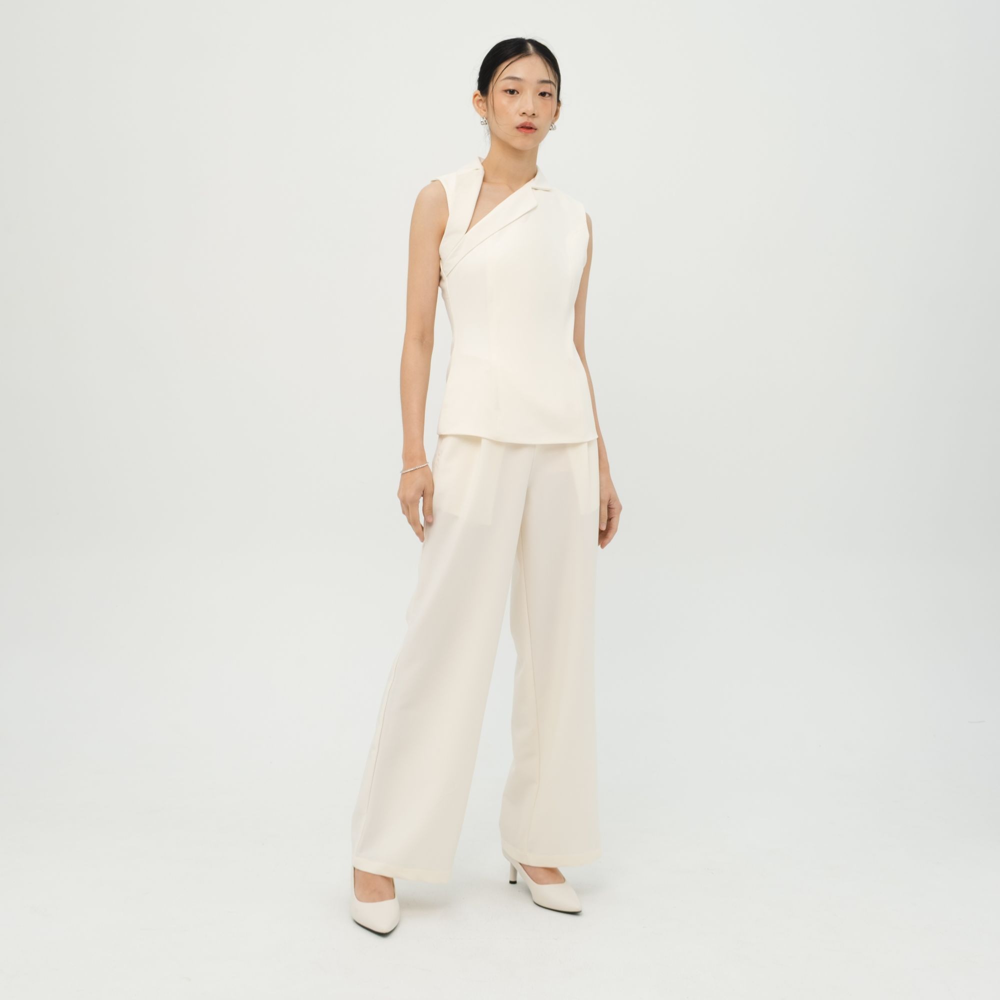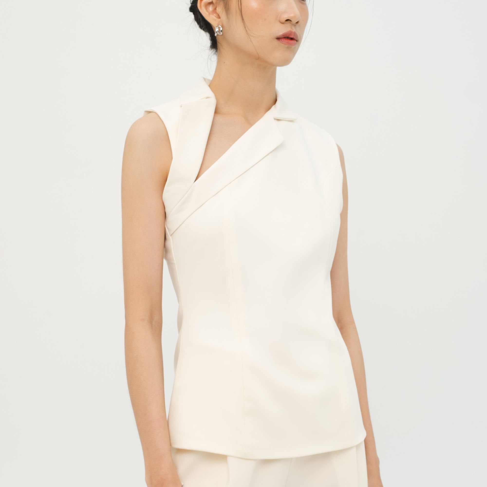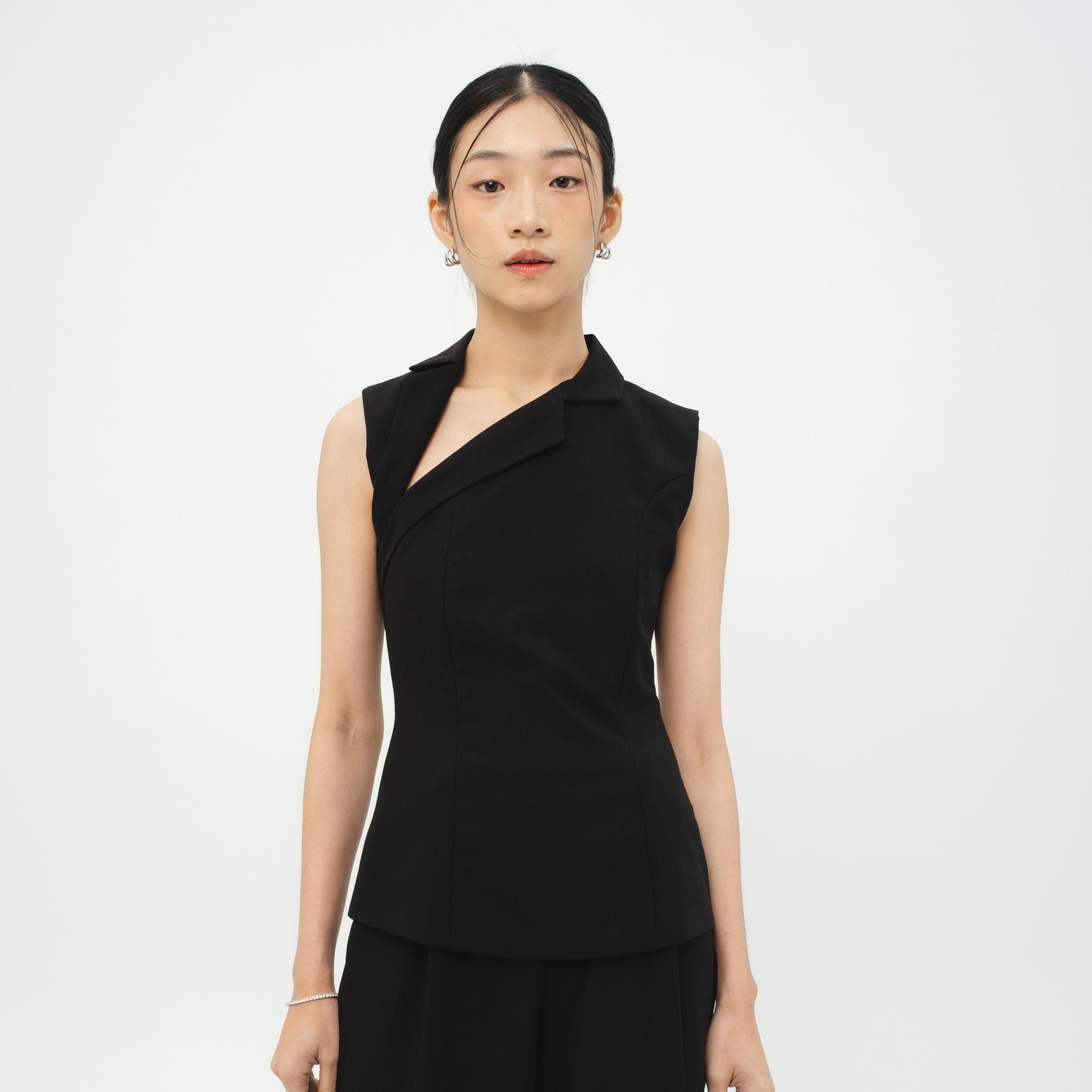 A Minimalist sleeveless top with an asymetric neckline that’s intantly eye catching and sophisticated. Easy to pair with any bottom,wheter for a date night or a casual hangout.