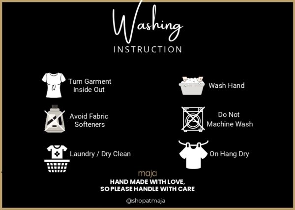 Turn garment inside outAvoid fabric softenersDo not machine washLaundry/ DrycleanWash handOn hang dry