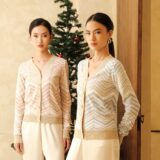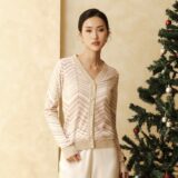 V-neck long-sleeve cardigan featuring a chevron pattern, nude edge lining, and classy buttons. Comfortable and versatile to wear from day to night.