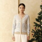 V-neck long-sleeve cardigan featuring a chevron pattern, nude edge lining, and classy buttons. Comfortable and versatile to wear from day to night.