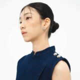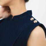 Sleeveless top with a high neckline, asymmetrical front design, and double gold accents. Stylish and elegant for any occasion.