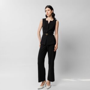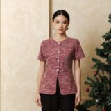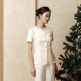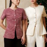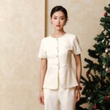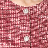Minimalist short-sleeve top made from textured tweed. Features a subtle flared hem and silver buttons, ideal for casual to formal occasions.