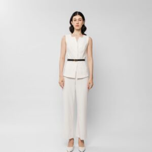 Minimalist short-sleeve top made from textured tweed. Features a subtle flared hem and silver buttons, ideal for casual to formal occasions.