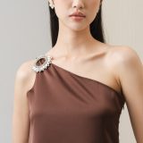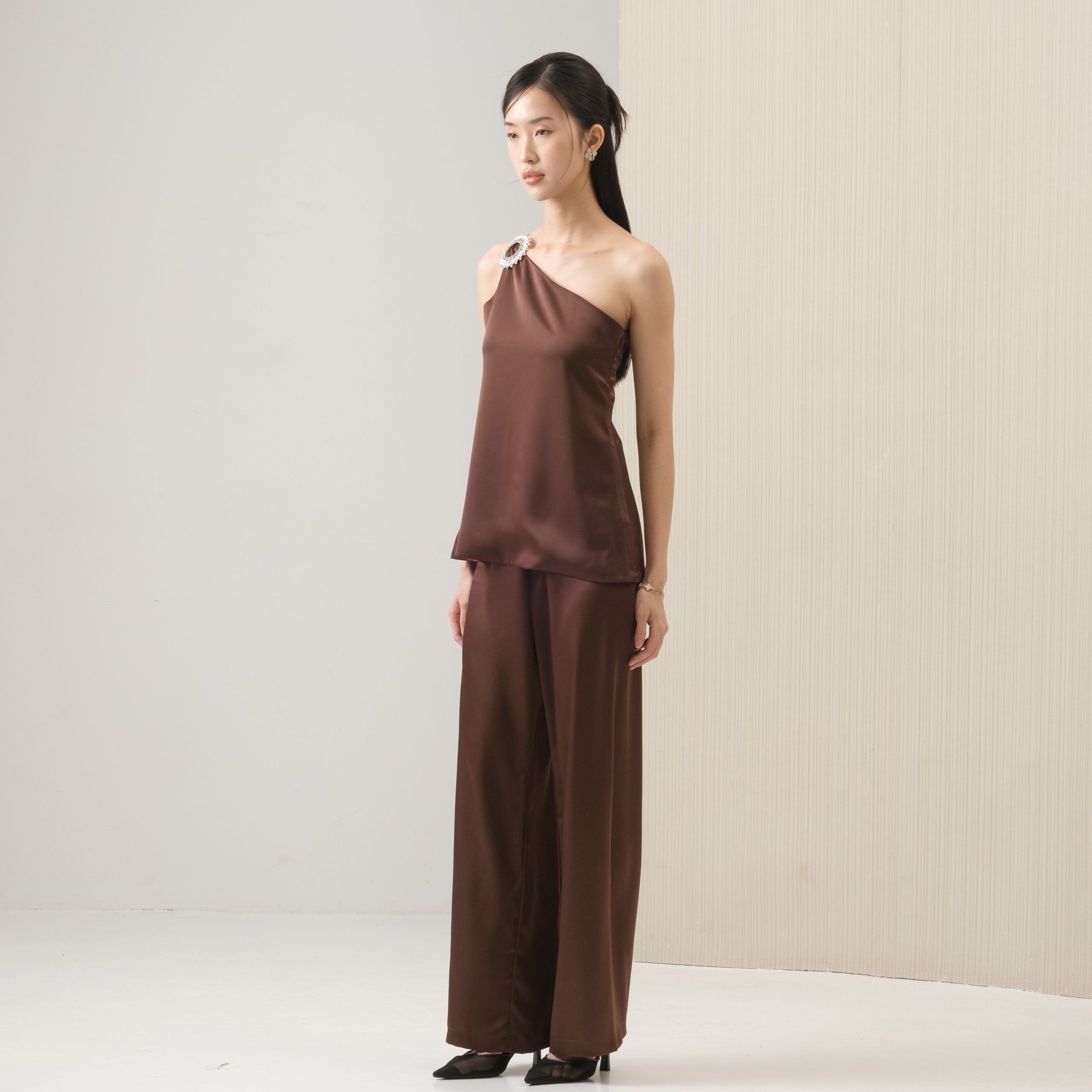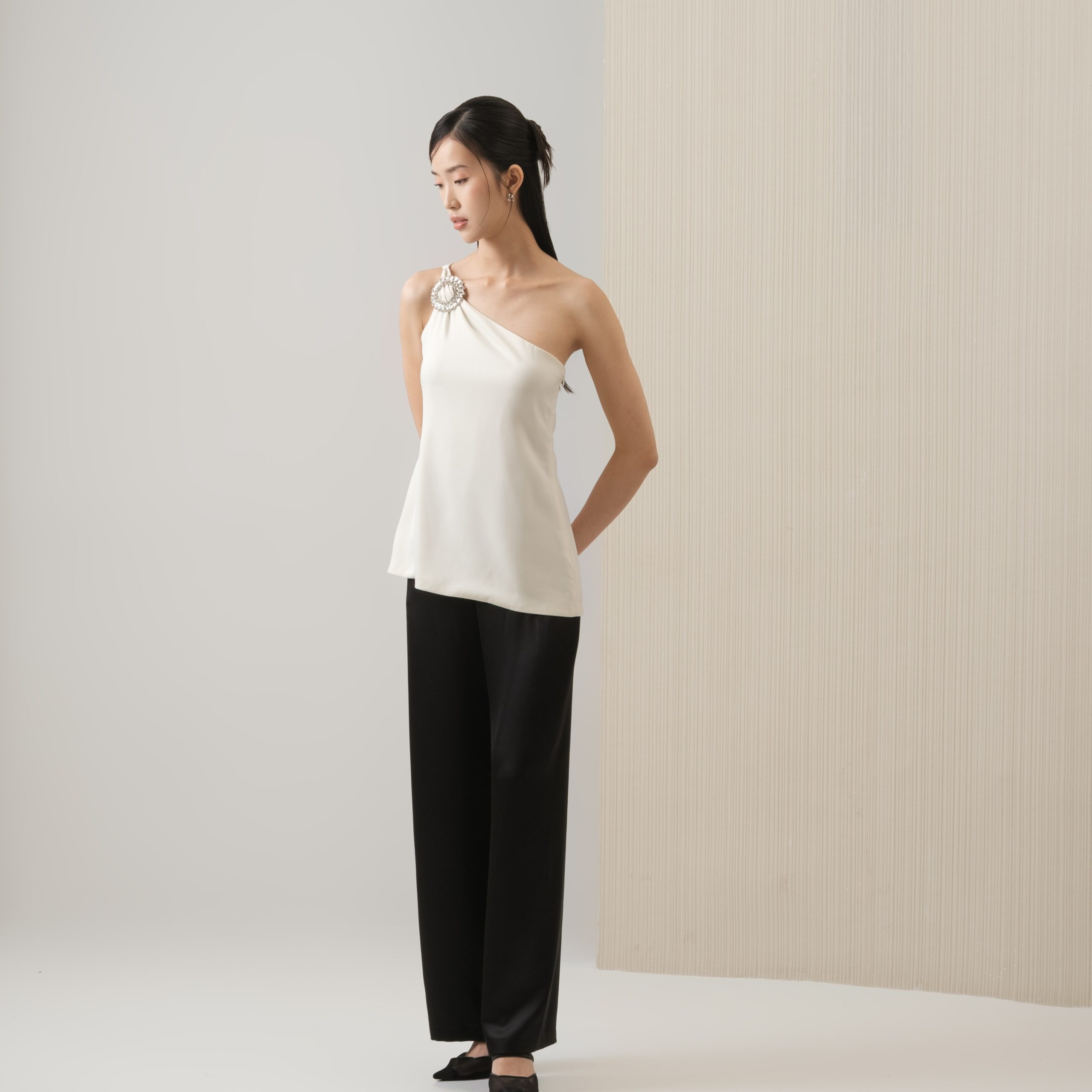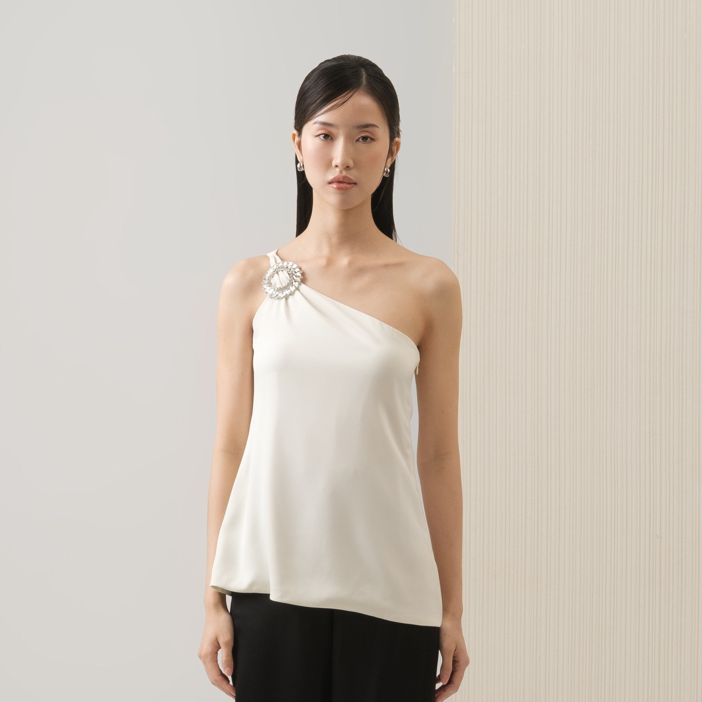 Elegant and refined, this satin top is designed with an asymmetric neckline. Finished with a silver diamond detail, it’s the perfect choice for a girls’ day out or a dinner date.