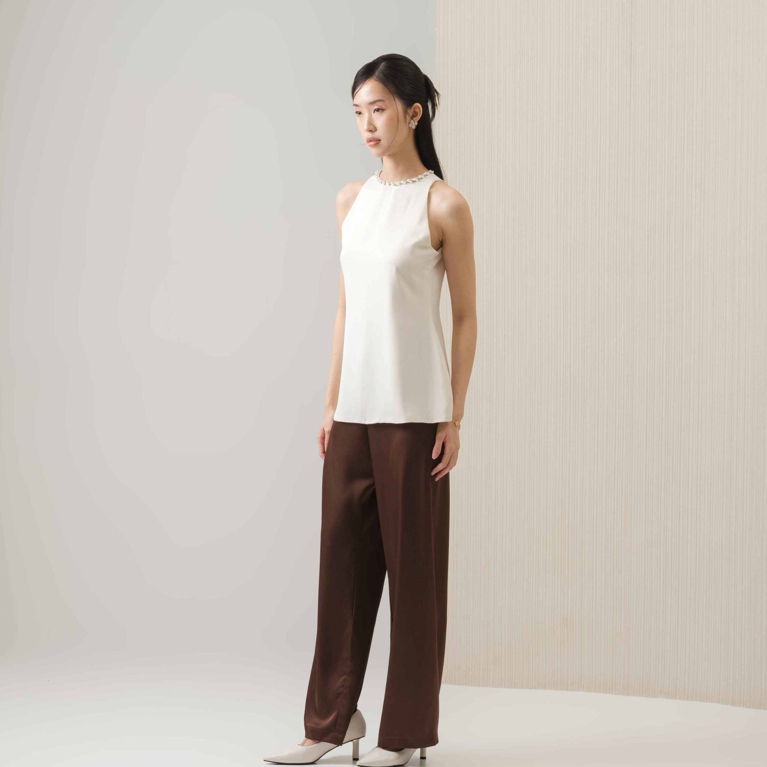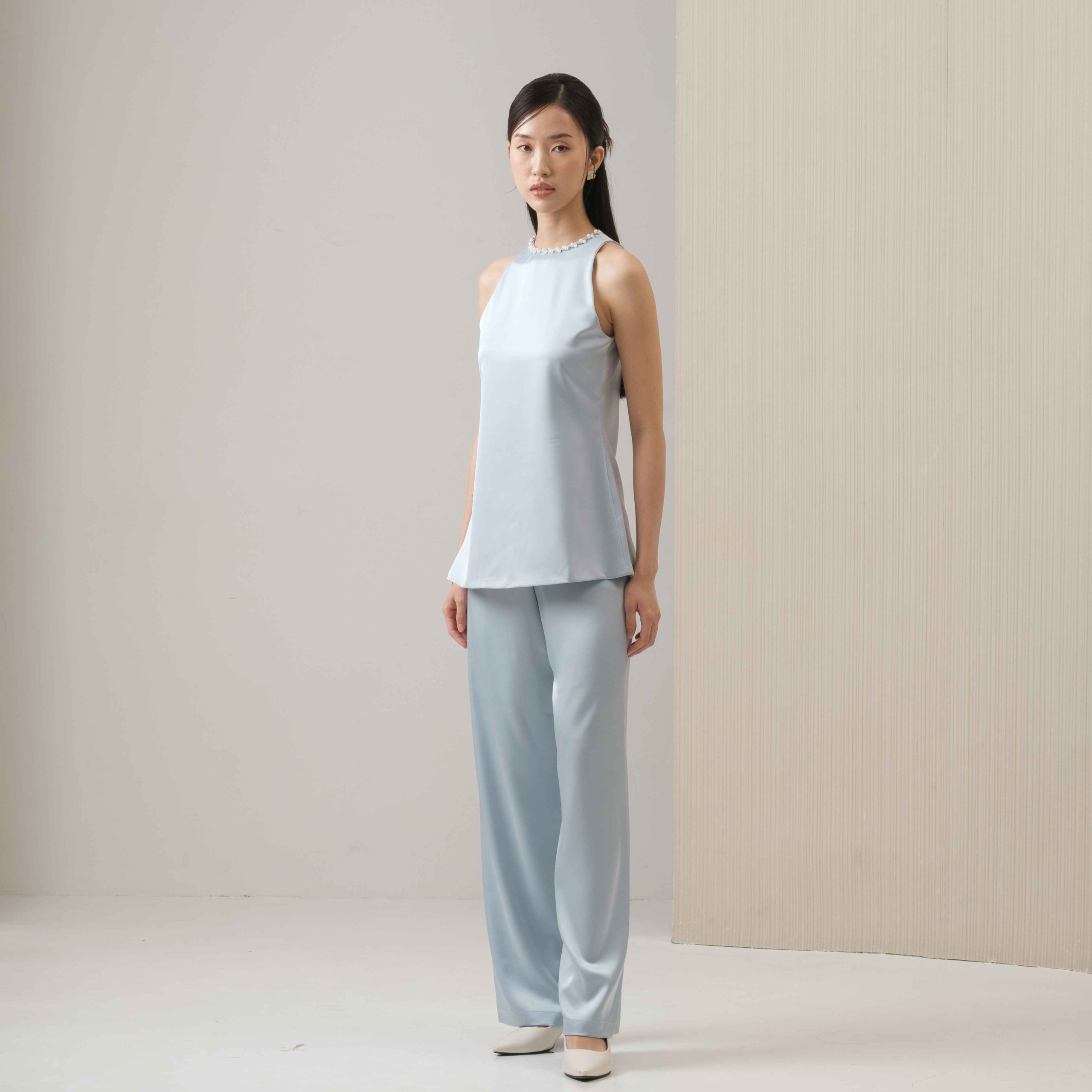 With a straight cut in soft satin, these pants make every step feel effortless and stylish. Perfect for everyday wear, they feature a stretch waistband and a sleek finish.
