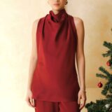 Sleeveless halter-neck top with a gracefully draped front. Made from luxurious satin, it’s the kind of piece that adds effortless shine to any occasion.