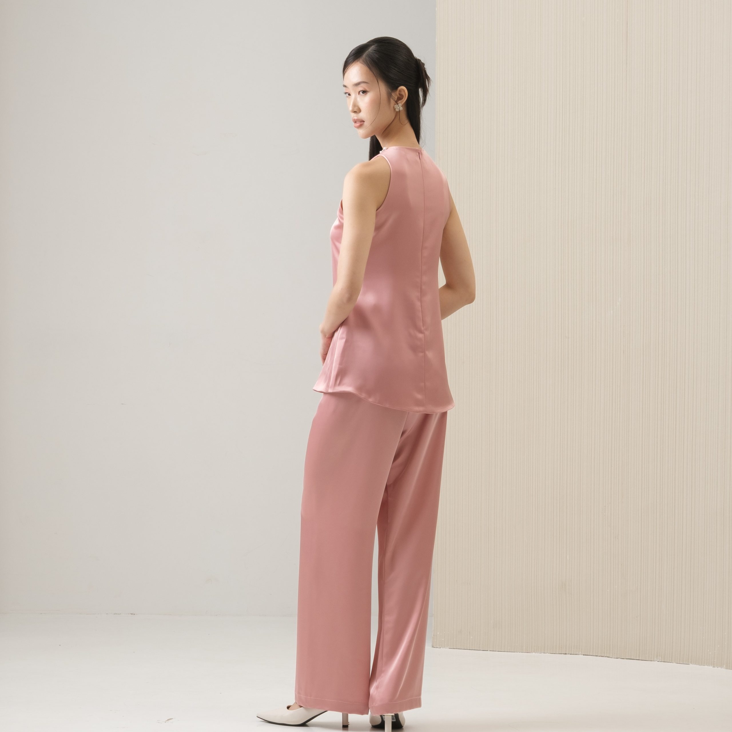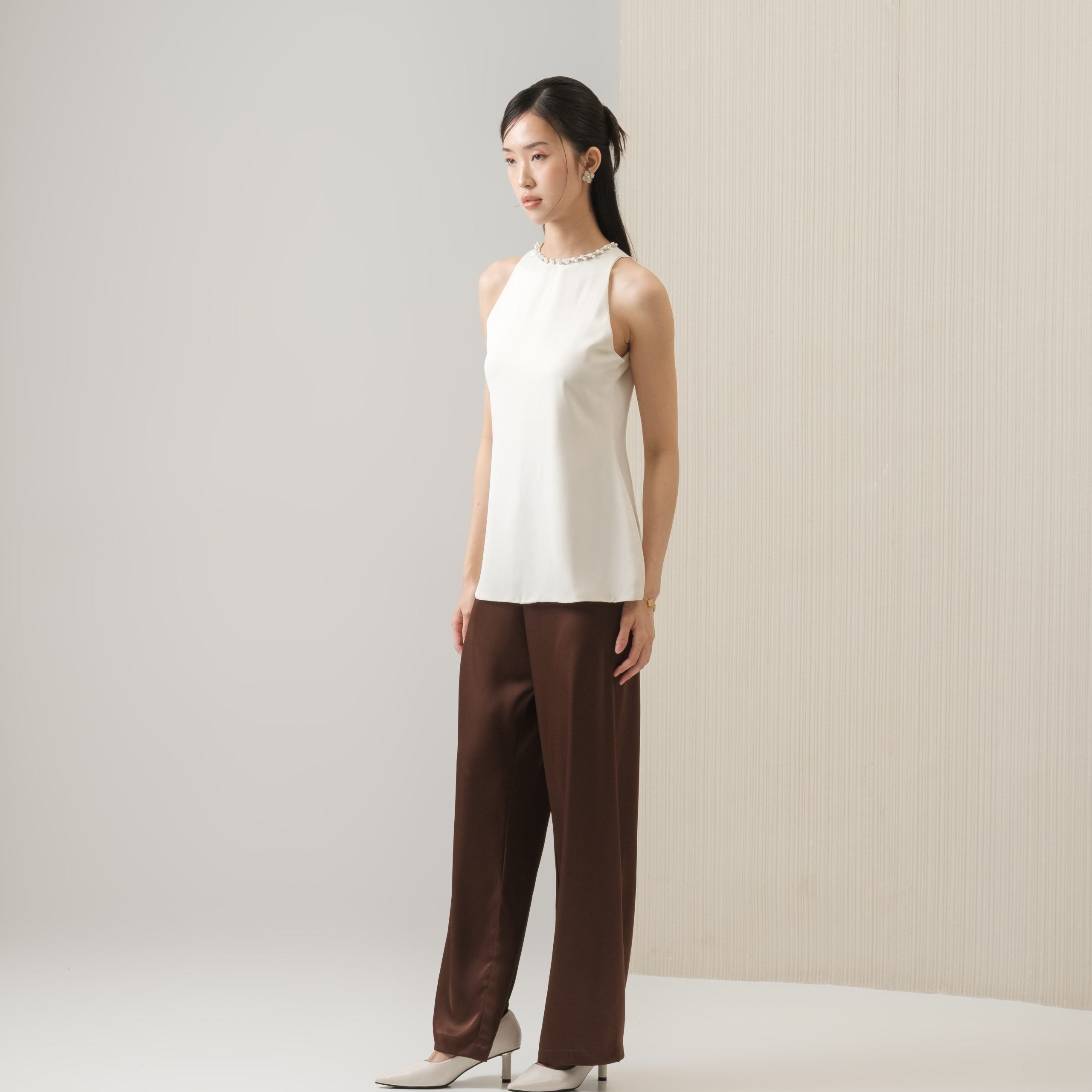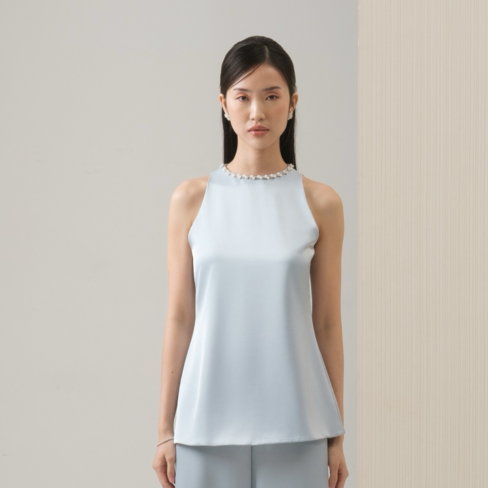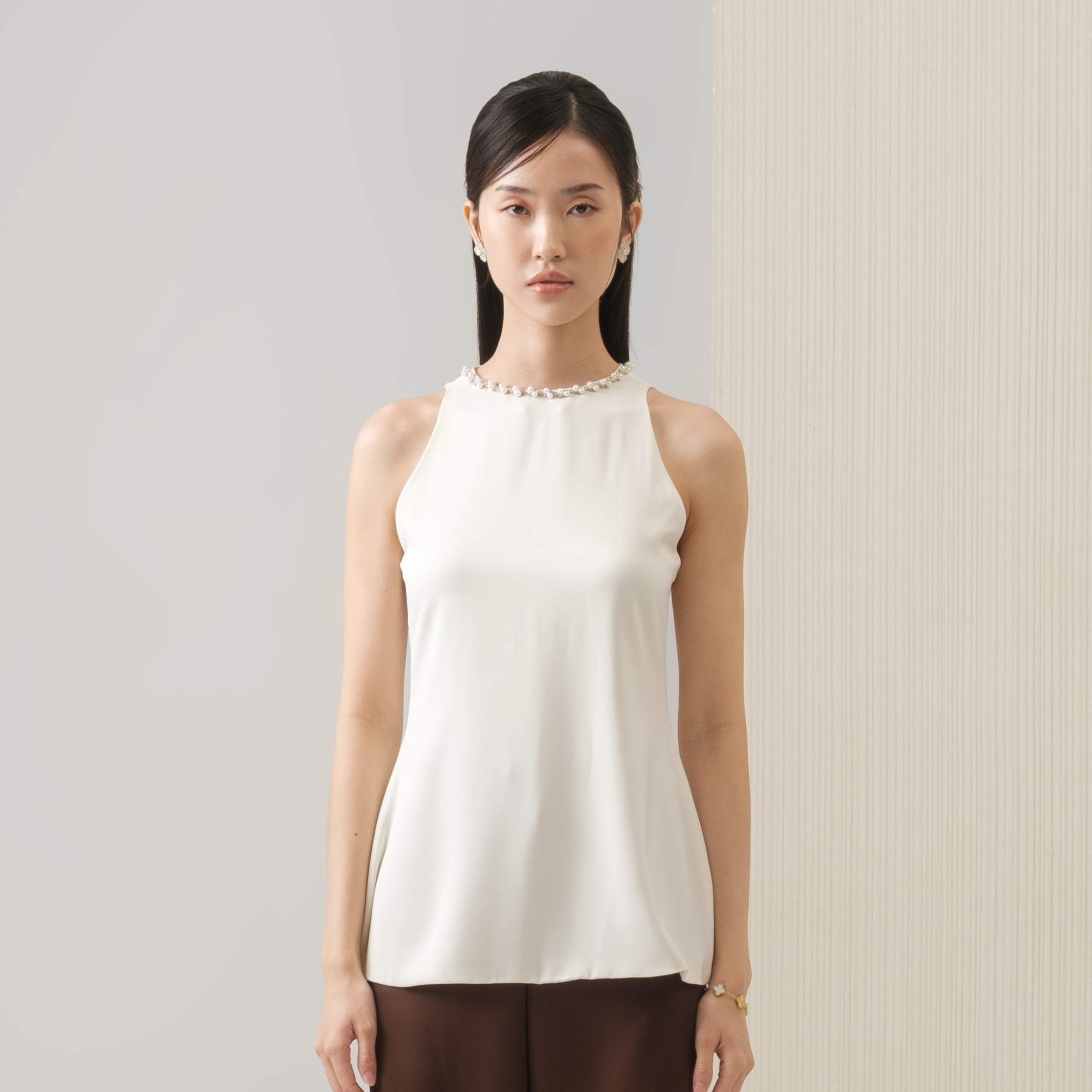 Cut from soft silk, this minimalist sleeveless top is refined with dainty pearls along the neckline. Complete with a back zipper for a sleek silhouette.