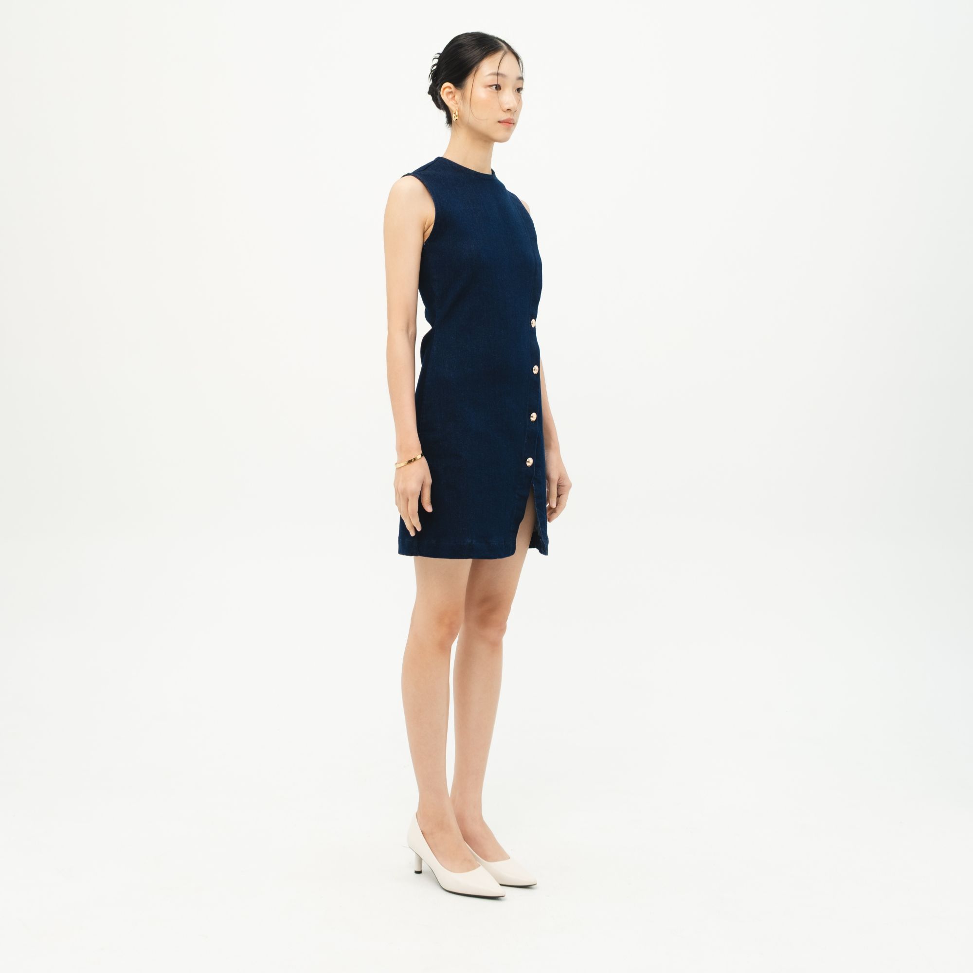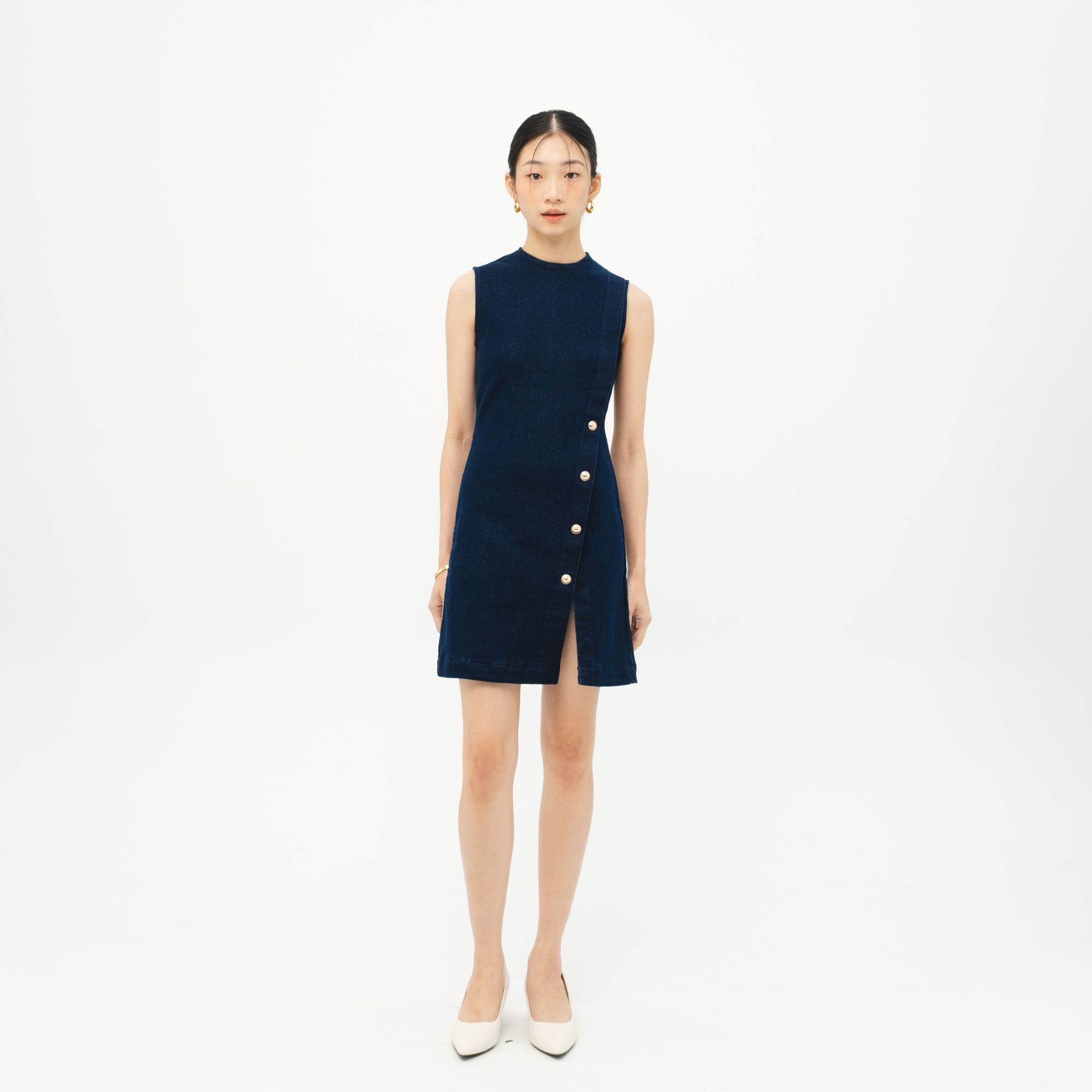 Sleeveless dress with a flattering front slit and gold buttons featuring the Maja logo. The stretchy denim keeps it cool and comfortable while still looking elegant.