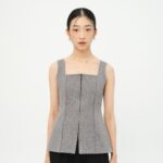 A sleek sleeveless top with a front zipper closure, fitted waist, and a subtle flare. A timeless piece that adds effortless elegance and remains stylish for years.