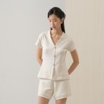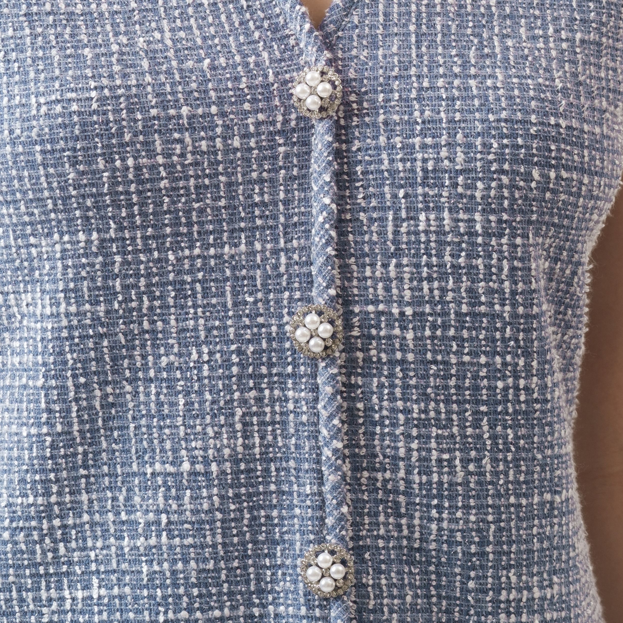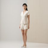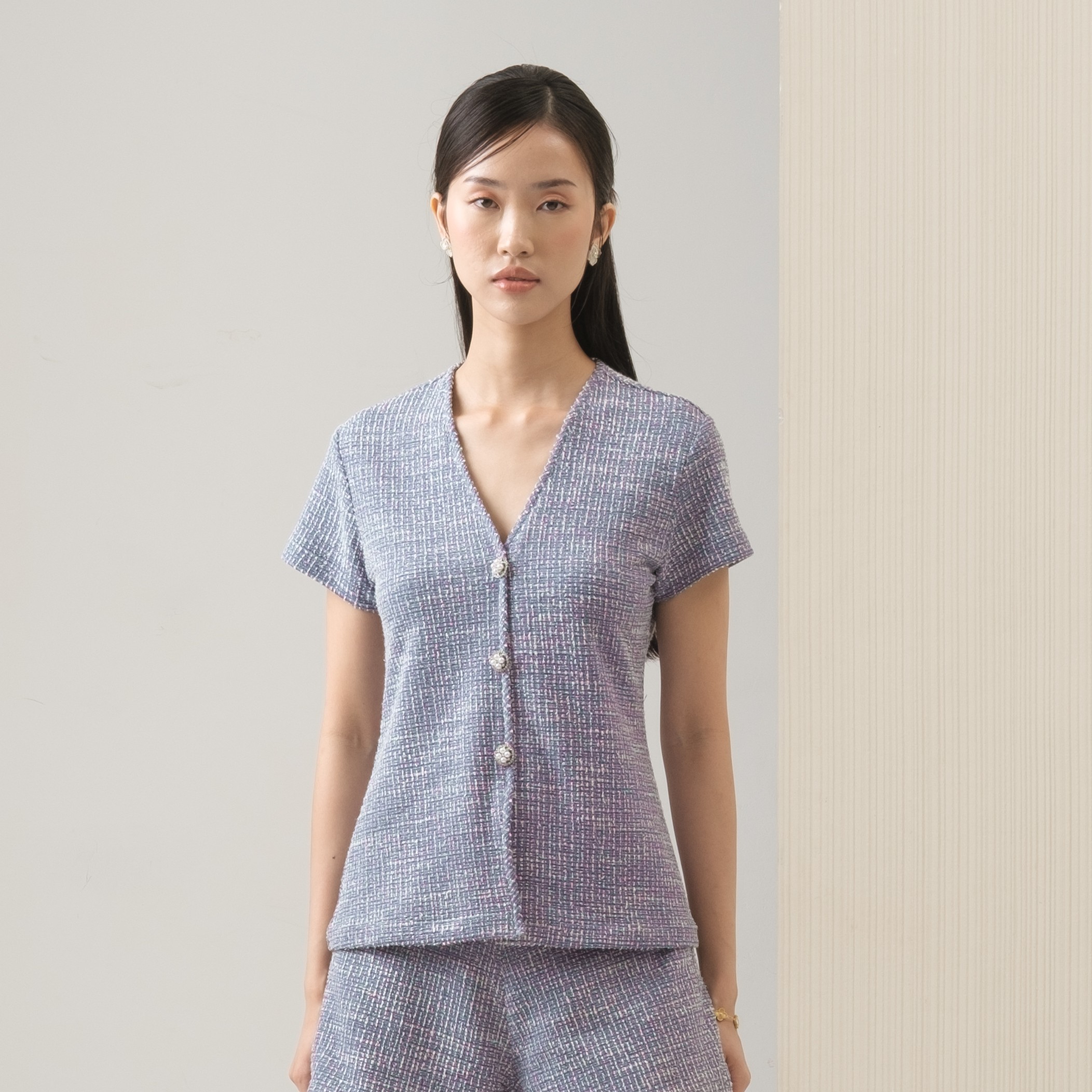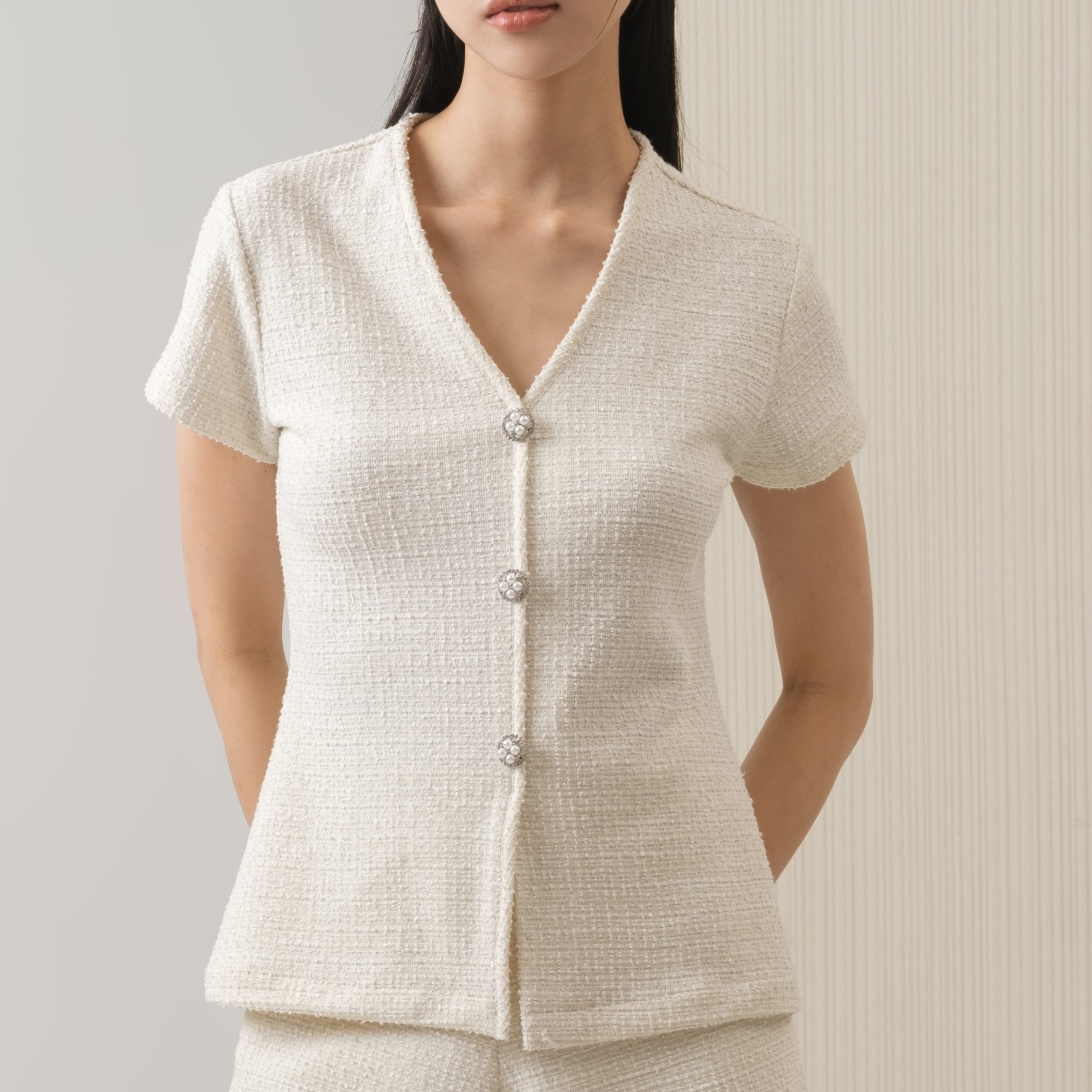 Short-sleeve top made from textured tweed with pearl buttons. Minimalist and versatile, easy to style with any bottoms for any plans.